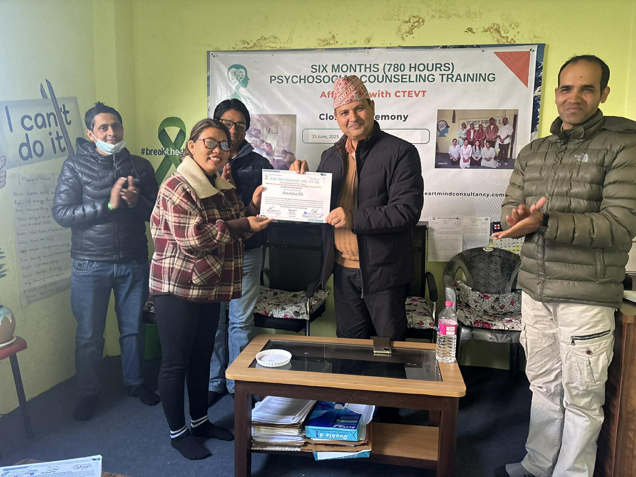 17 Jan, 2026, Pokhara, Magh 3 — Heart-Mind Consultancy, Pokhara, has successfully completed a six-month psychosocial counseling training program, with 16 participants graduating from the second and third batches. The second batch ran from 25 February 2025 to 15 September 2025, while the third batch was conducted from 15 June 2025 to 14 January 2026.